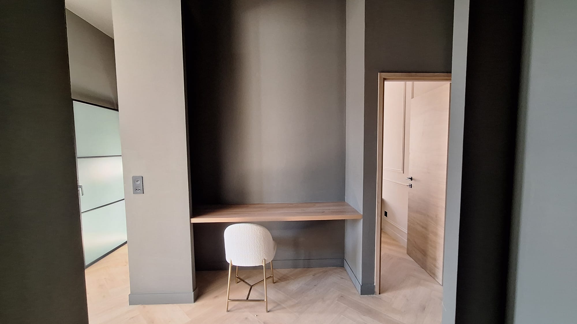 L’appartement comprend également une entrée agrémentée d’un espace bureau fonctionnel pour les séjours affaires,